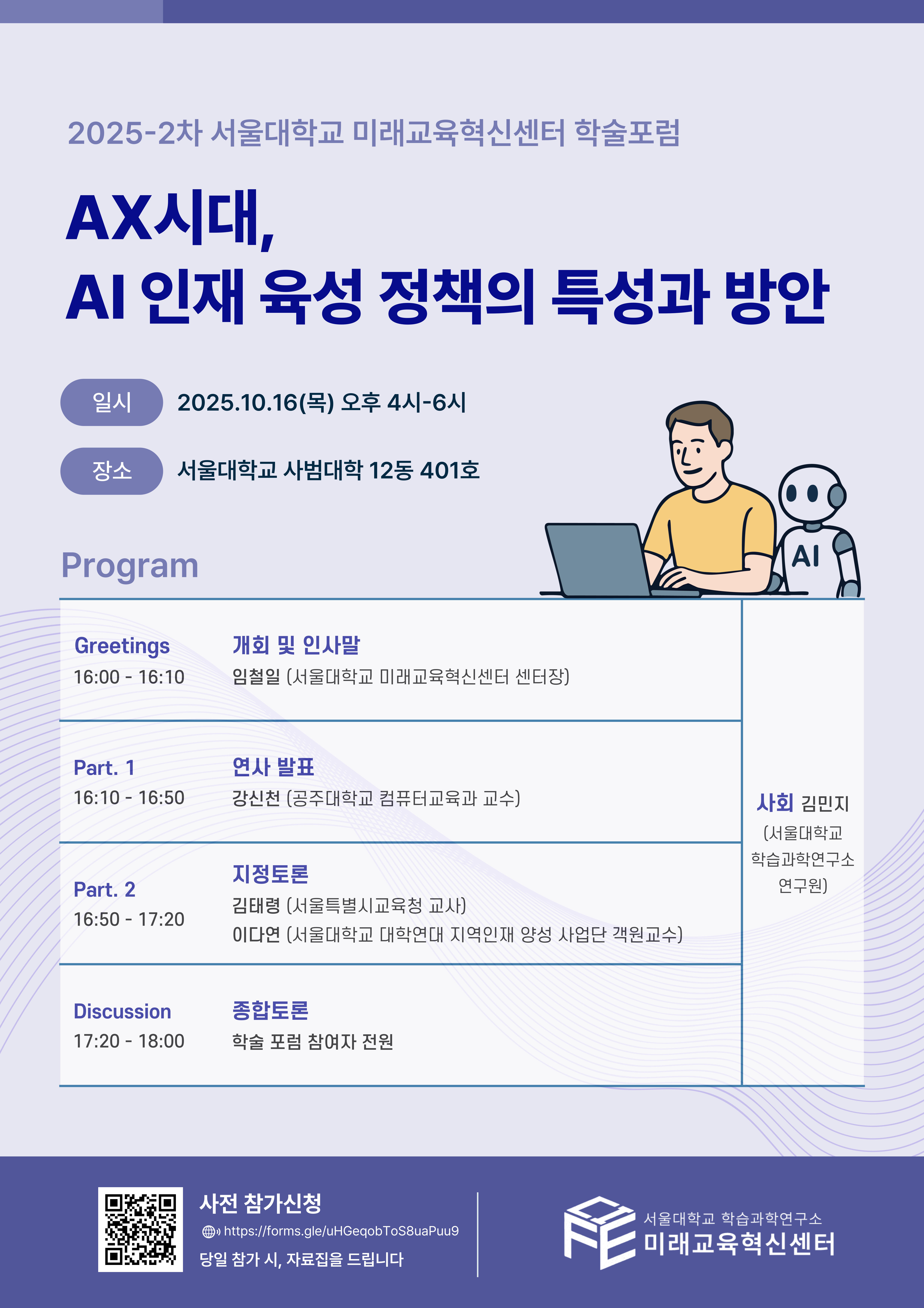 안녕하세요, 서울대학교 사범대학 학습과학연구소 미래교육혁신센터에서는 「AX시대, AI 인재 육성 정책의 특성과 방안」이라는 주제로 2025년 2차 학술포럼을 개최합니다. AI 인재 양성을 위한 정책 방향과 교육 현장의 시사점을 논의하는 뜻깊은 자리에 많은 관심과 참여 부탁드립니다. ◈행사 개요 일시: 2025년 10월 16일(목) 오후 4시 ~ 6시 장소: 서울대학교 사범대학 12동 401호 프로그램 개회 인사 - 임철일 (서울대 미래교육혁신센터 센터장) 연사 발표 - 강신천 (공주대학교 컴퓨터교육과 교수) 지정토론 - 김태령 (서울특별시교육청 교사), 이다연 (서울대 지역인재 양성 사업단 객원교수) 종합토론 - 학술포럼 참여자 전원 ◈참가 신청 https://forms.gle/MXy9dShw7WKMNcNX6 ※ 참석자에게는 온라인 자료집이 제공됩니다.