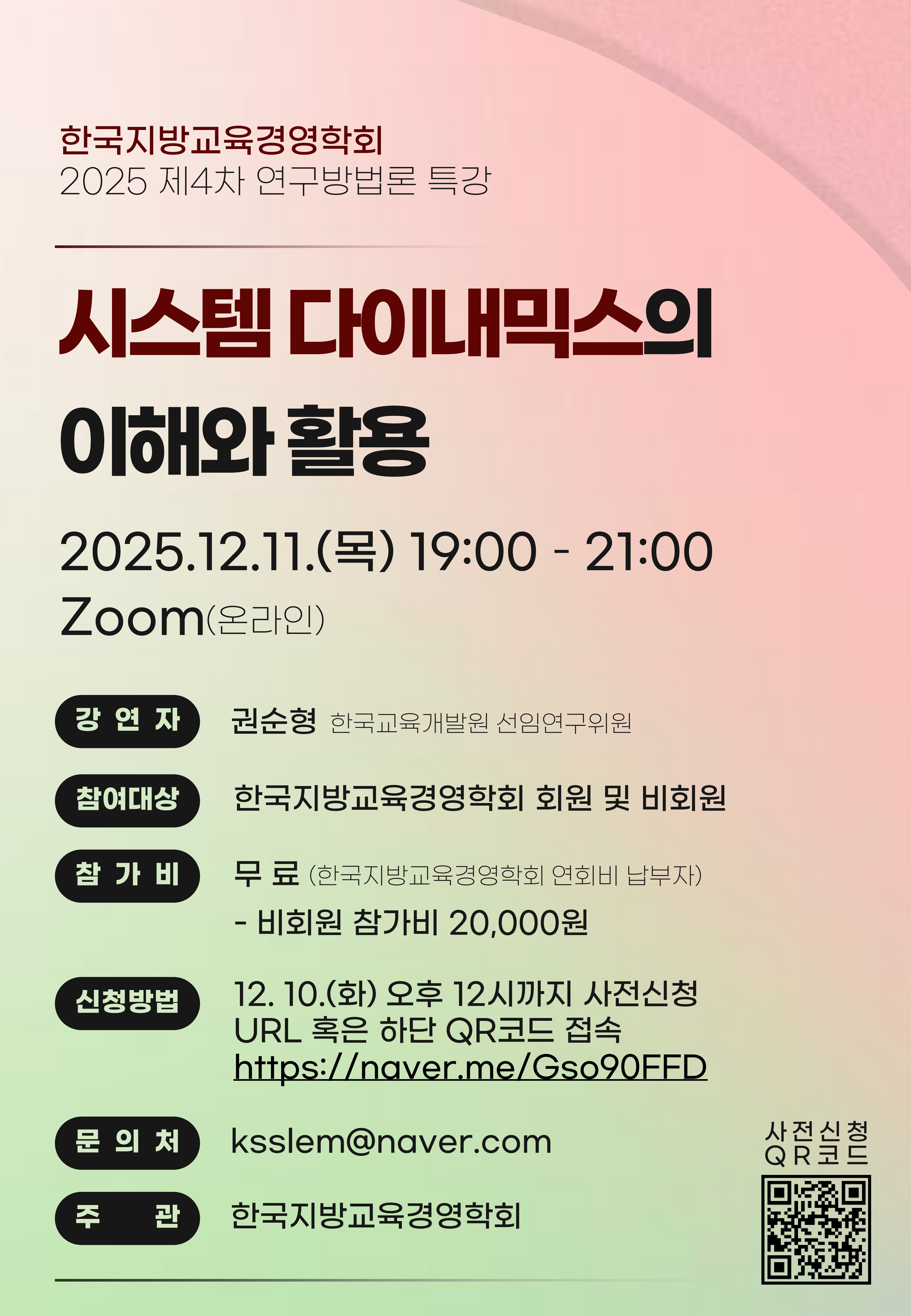 2025 제4차 연구방법론 특강<시스템 다이내믹스의 이해와 활용>을 12월 11일(목)에 개최하니 관심 있으신 분들의 많은 참여 부탁드립니다(12/10(수) 오후 12시까지 신청).