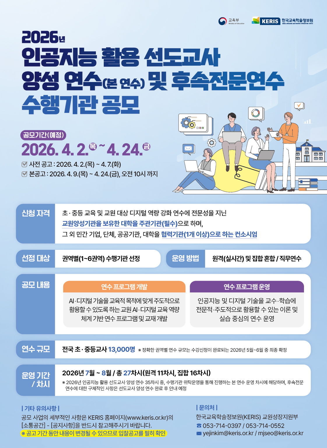 | [한국교육학술정보원(KERIS)] 2026년 인공지능 활용 선도교사 연수(본 연수) 및 후속전문연수 수행기관 공모 사업 | ||