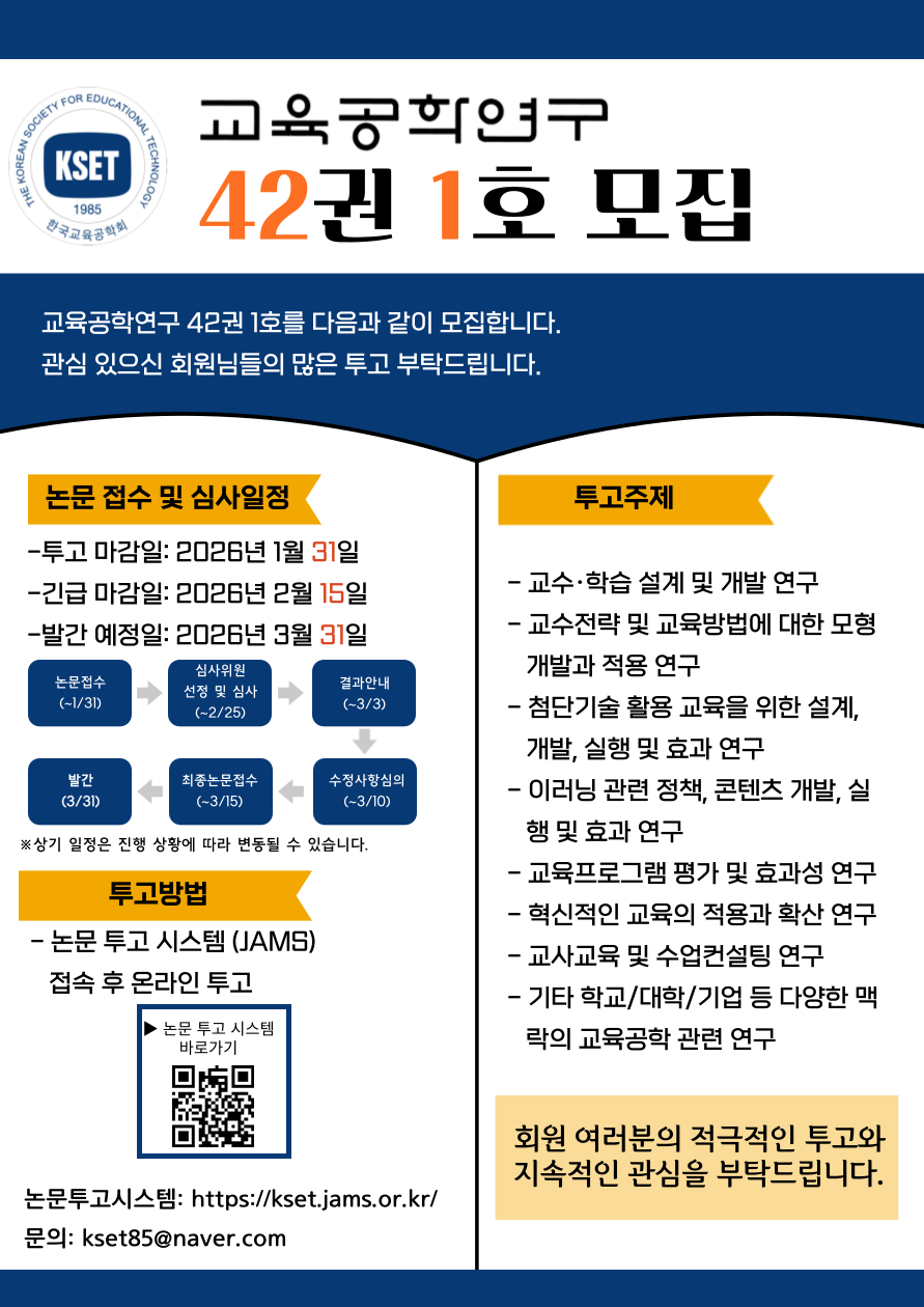 현재 교육공학연구에서는 1월 31일(토)까지 42권 1호 논문을 모집하고 있으며, 여러분의 소중한 연구를 기다리고 있습니다.