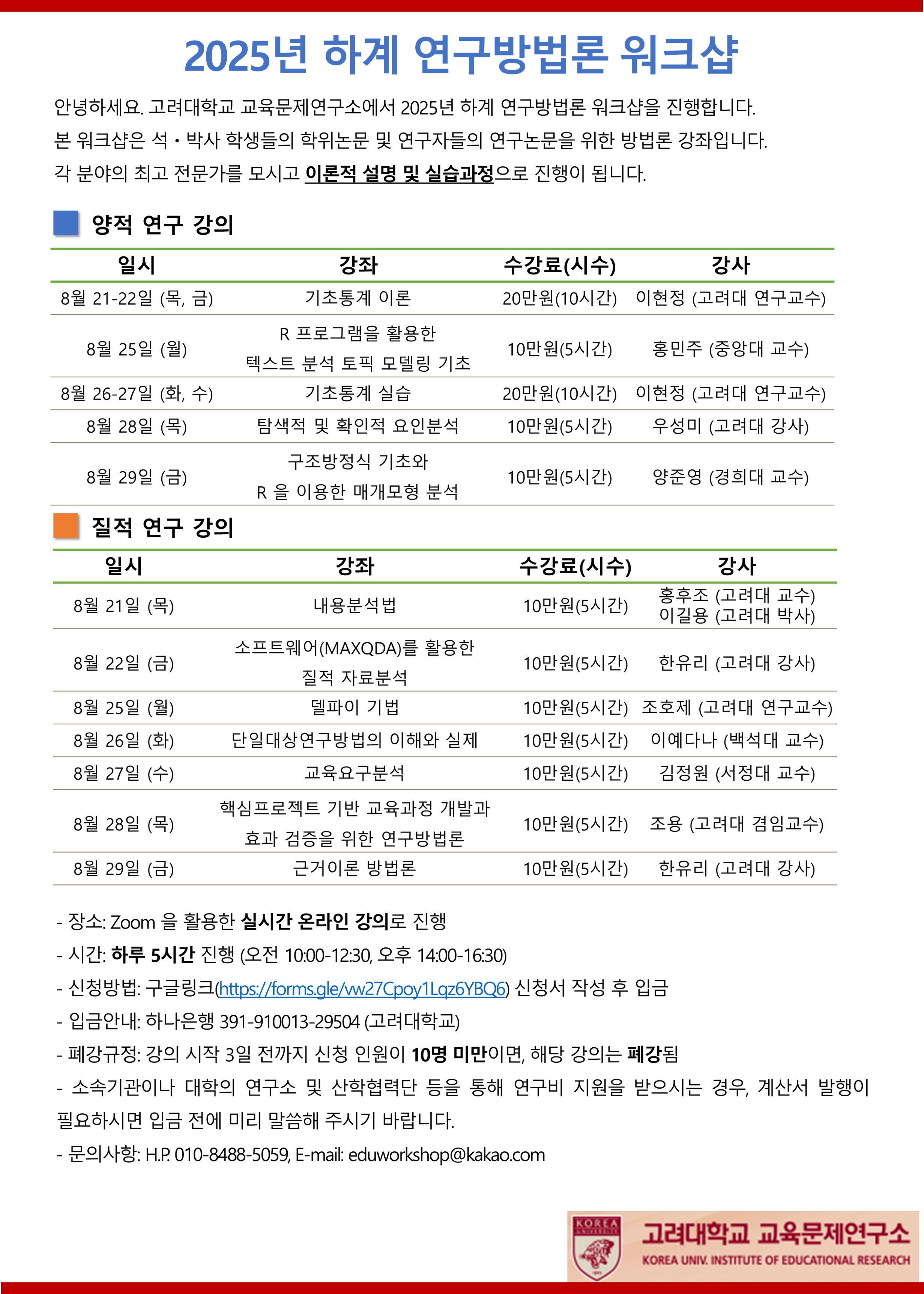 안녕하십니까. 고려대학교 교육문제연구소에서는 매 학기 훌륭한 강사님들을 모시고 학위논문 및 연구논문 작성을 위한 양적, 질적 연구방법론 워크샵 을 진행합니다. 2025년 하계 연구방법론 특강은 다음과 같이 진행될 예정이며, 자세한 내용은 첨부파일을 확인하여 주시기 바랍니다. 감사합니다. 수강 신청링크: https://forms.gle/vw27Cpoy1Lqz6YBQ6