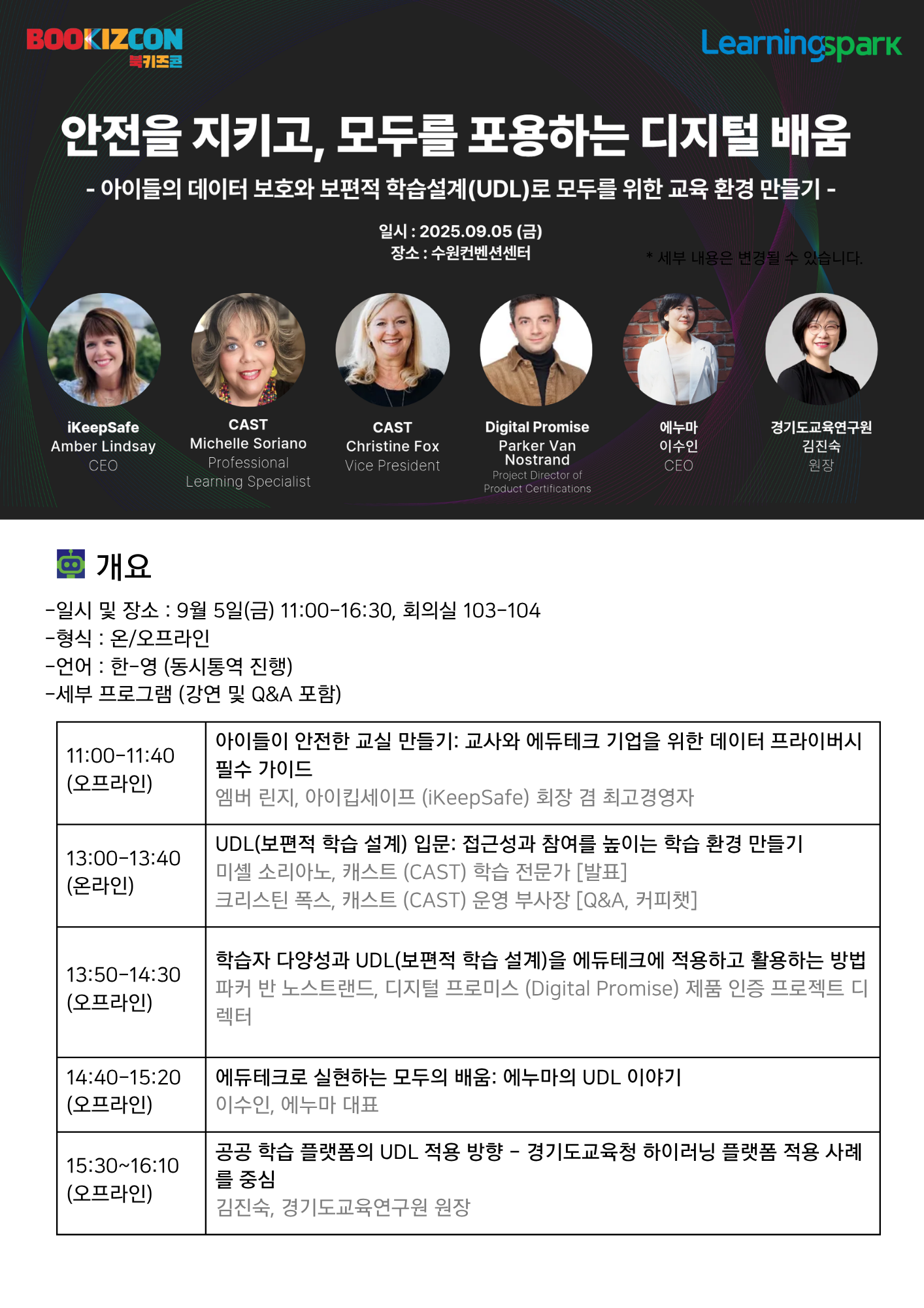 안녕하세요, 에듀테크 리서치/컨설팅 스타트업인 러닝스파크 이사 윤성혜 입니다. 저희가 이번에 어린이 도서/테크/콘텐츠 박람회인 북키즈콘과 연계한 행사로 "안전을 지키고, 모두를 포용하는 디지털 배움: 아이들의 데이터 보호와 보편적 학습설계(UDL)로 모두를 위한 교육 환경 만들기"라는 주제로 세션을 개최하게 되었습니다. UDL을 만든 기관인 CAST의 학습 전문가인 미셸 소리아노, 운영 부사장인 크리스티 폭스의 강연뿐만 아니라 Digital Promise, iKeepSafe 등 글로벌 전문 기관 연사, 에누마 이수인 대표의 강연까지 한 자리에서 만나보기 어려운 연사들을 초대하였습니다. 이 좋은 기회를 학회 회원님들께도 공유드리고자 합니다. 행사 개요