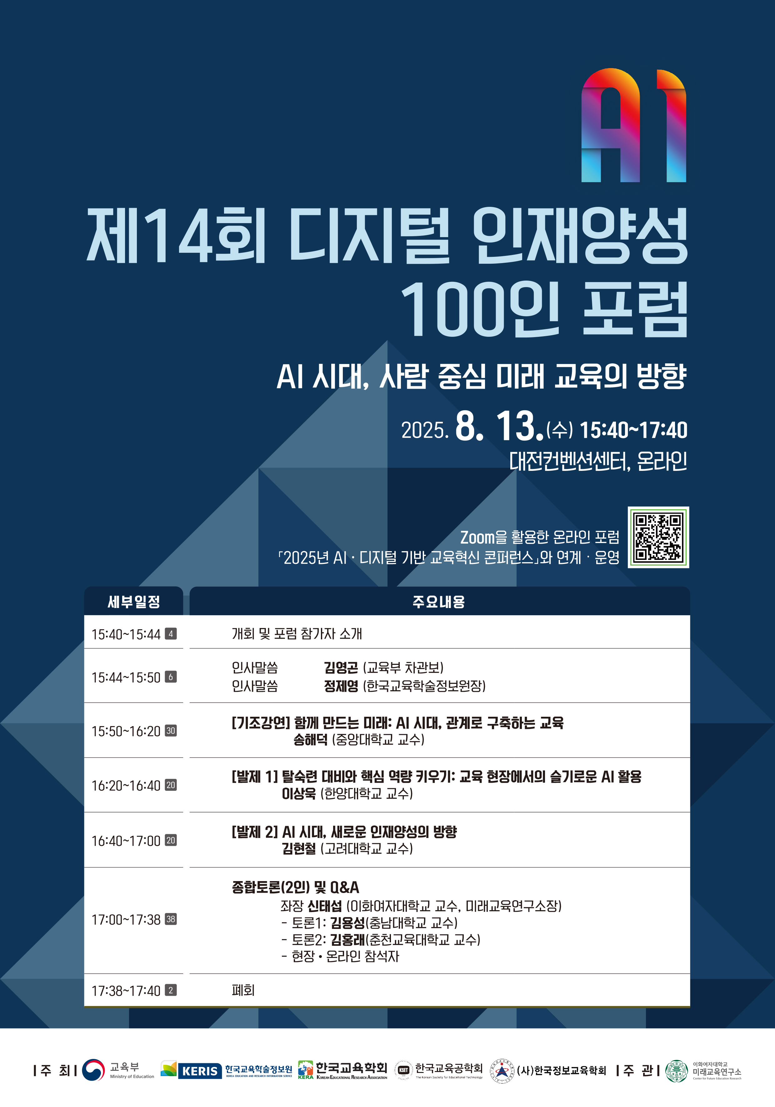 ◦ 주제 : AI 시대, 사람 중심 미래 교육의 방향 ◦ 일시 : 2025. 8. 13.(수) 15:40~17:40 ◦ 장소 : 대전 컨벤션센터, 온라인(Zoom) ※ 대전역에서 행사장까지 셔틀버스 운행 (약 20분 소요) ◦ 참석 : 전문가 및 교육관계자 ◦ 주최 : 교육부 · 한국교육학술정보원 · 한국교육학회 · 한국교육공학회 · 한국정보교육학회 ◦ 주관 : 이화여자대학교 미래교육연구소