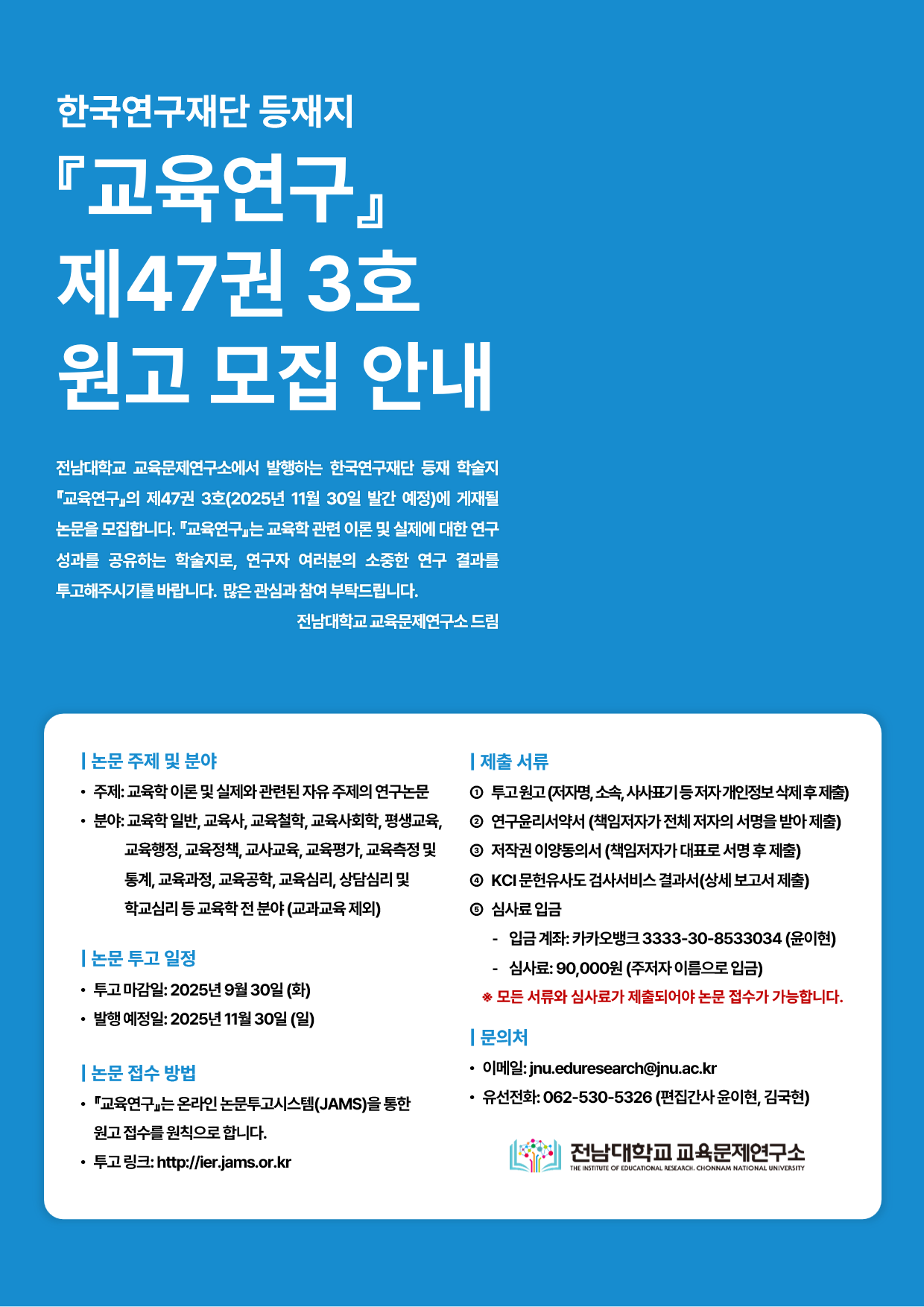회원 여러분, 안녕하십니까? 『교육연구』 편집국입니다. 아래와 같이 『교육연구』 (KCI 등제지) 제47권 3호 원고 투고 마감 기한을 안내 드리오니, 관심 있는 회원 여러분들의 많은 투고와 참여 부탁 드립니다. ※ 논문의 주제 및 분야 ○ 주제: 교육학 이론 및 실제와 관련된 자유 주제의 연구논문 ○ 분야: 교육학 일반, 교육사, 교육철학, 교육사회학, 평생교육, 교육행정, 교육정책, 교사교육, 교육평가, 교육측정 및 통계, 교육과정, 교육공학, 교육심리, 상담심리 및 학교심리 등 교육학 전 분야 (교과교육 제외) ○ 47권 3호 발간 예정일: 2025년 11월 30일 ○ 투고 마감일: 2025년 9월 30일(화) ○ 접수방법: 저희 『교육연구』는 온라인 논문투고시스템(JAMS)을 통한 원고접수를 원칙으로 하고 있습니다. 논문 투고 링크: https://ier.jams.or.kr/co/<wbr>main/jmMain.kci ※ 신청원고와 함께 다음의 투고양식을 준수하여 제출해 주십시오. ① 투고 원고 (저자, 소속, 사사표기 등 저자의 개인정보를 모두 삭제 후 제출) ② 연구윤리서약서 (책임저자께서 전체 저자의 서명을 받은 후 제출) ③ 저작권 이양동의서 (책임저자가 대표로 서명 후 제출) ④ 투고논문에 대한 KCI 문헌유사도 검사서비스 결과서 (상세) [①, ②, ③은 첨부한 파일에 따라 작성해 주십시오.] ⑤ 심사료입금(카카오뱅크 윤이현, 3333-30-8533034 , 90,000원, 주저자 이름) 위 자료가 모두 제출되면 논문 접수가 가능합니다. 논문 투고에 관하여 문의 사항이 있으신 경우 언제든지 편집국 메일( jnu.eduresearch@jnu.ac.kr )로 문의 주시기 바랍니다. 감사합니다. ![]() - 『교육연구』 편집국 드림 - |