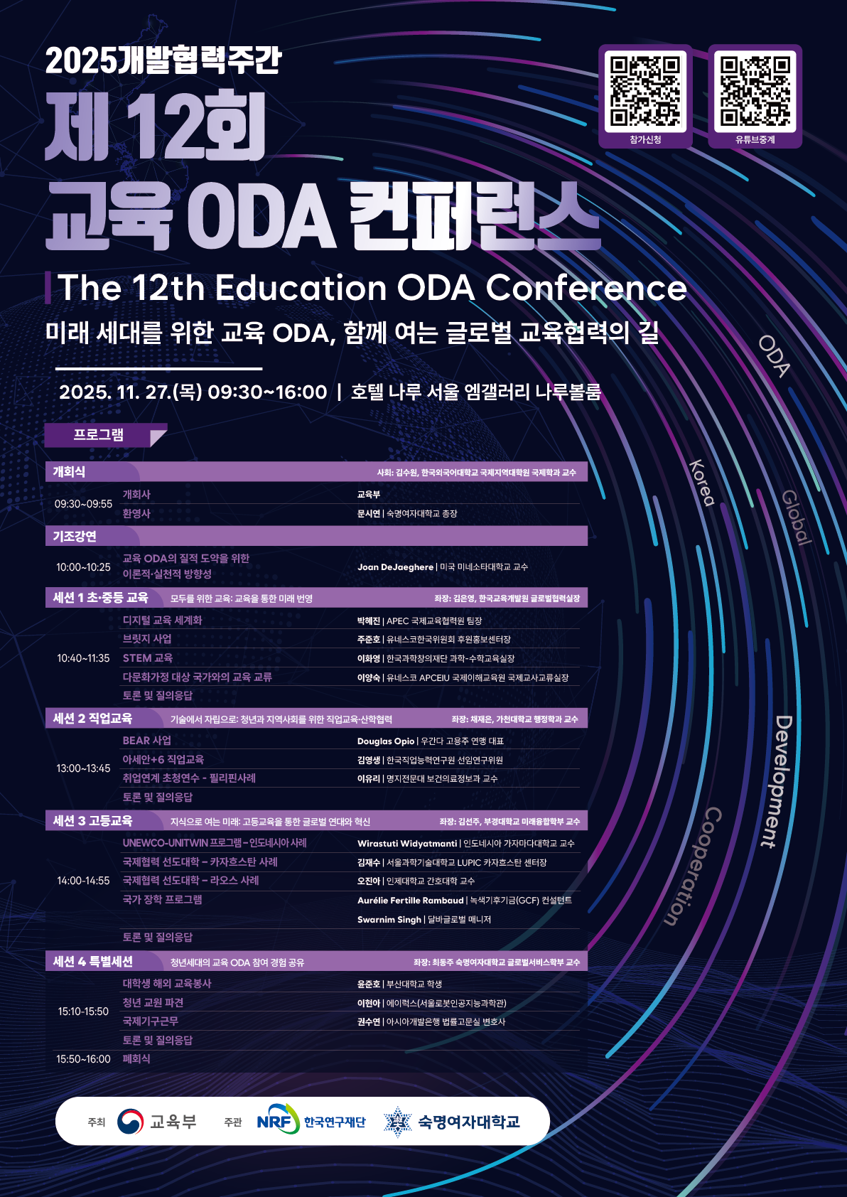 안녕하세요. 숙명여자대학교 글로벌거버넌스연구소입니다. 2025개발협력주간을 맞이하여, 다가오는 11월 27일(목) 호텔나루서울 엠갤러리 나루볼룸에서 「 제12회 교육 ODA 국제컨퍼런스 」가 개최됩니다. 교육부가 주최하고, 한국연구재단과 숙명여자대학교가 주관하는 본 컨퍼런스는, 교육 ODA(공적개발원조)의 성과와 방향을 논의하는 국내 대표 교육ODA 행사로, 국내외 교육·개발협력 관계자, 학계, 국제기구 전문가 등이 한자리에 모여 ‘미래 세대를 위한 교육 ODA, 함께 여는 글로벌협력의 길’을 주제로 심도 있는 논의를 이어갈 예정입니다. 귀 기관의 많은 관심과 참석을 부탁드립니다. 자세한 사항은 아래 내용을 참고해주시기 바랍니다. ![]() [ 행 사 개 요 ] ▣ 일시: 2025년 11월 27일(목) 09:30~16:00 ▣ 장소: 호텔 나루 서울 엠갤러리 나루볼룸 (서울 마포구 마포대로 8) ▣ 주제: 미래 세대를 위한 교육 ODA, 함께 여는 글로벌 교육협력의 길 ▣ 주최: 교육부 ㅣ 주관: 한국연구재단, 숙명여자대학교